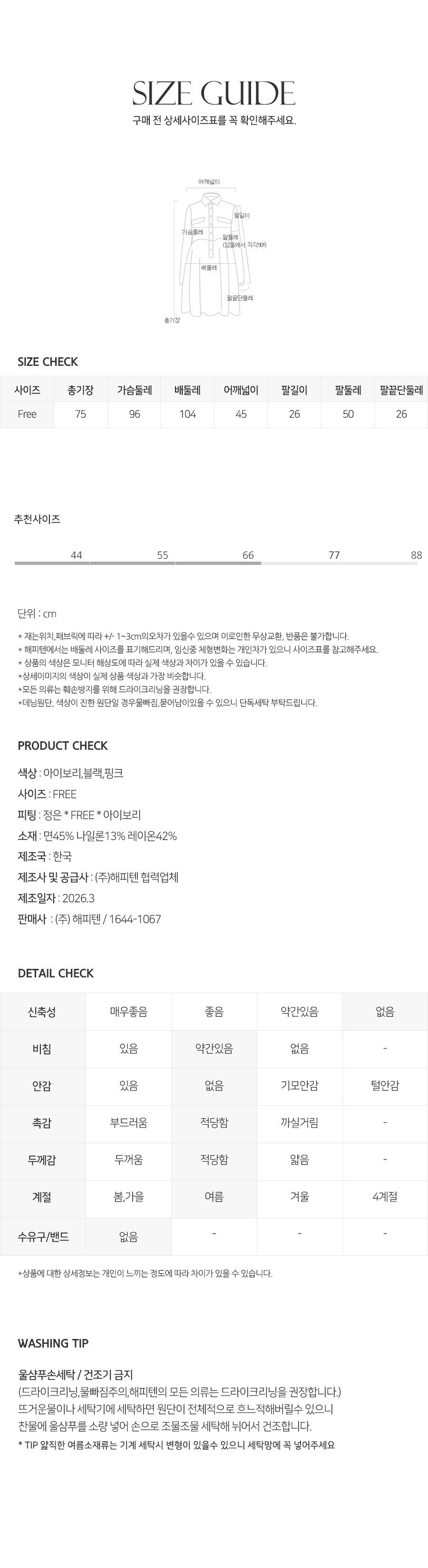 상세페이지의 세탁법을 준수하지 않아 생기는 문제에 대해서는 해피텐이 책임지지 않습니다.